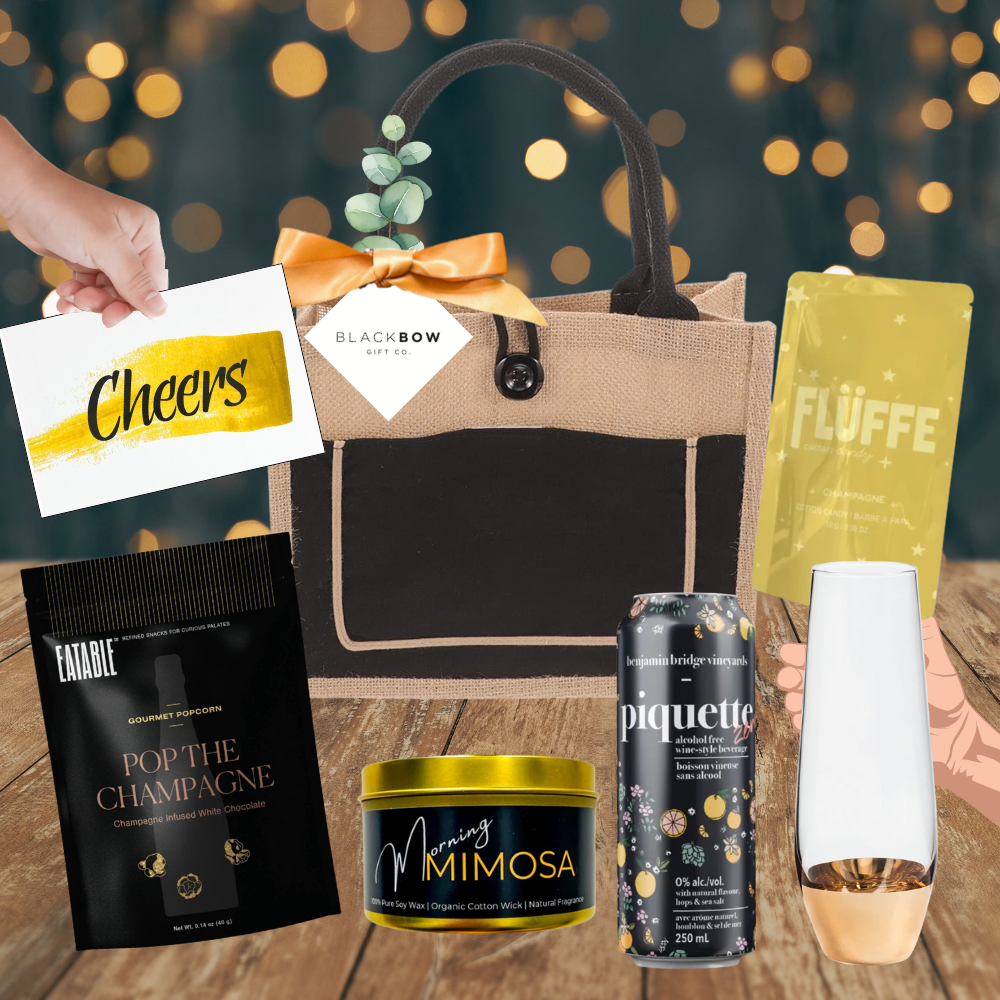 - Your gift items are packaged artfully and securely in a Black Jute Tote with Button Closure with decorative ribbon presentation for an elevated look.