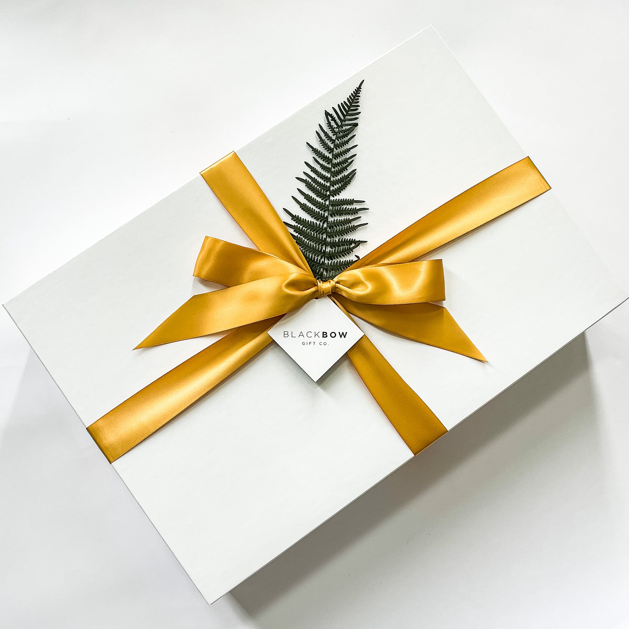 - Your gift box is tied perfectly with a premium double satin ribbon (as shown) and is accented with our hand-selected and seasonal preserved florals, greenery and other naturals making each gift that much more special and unique