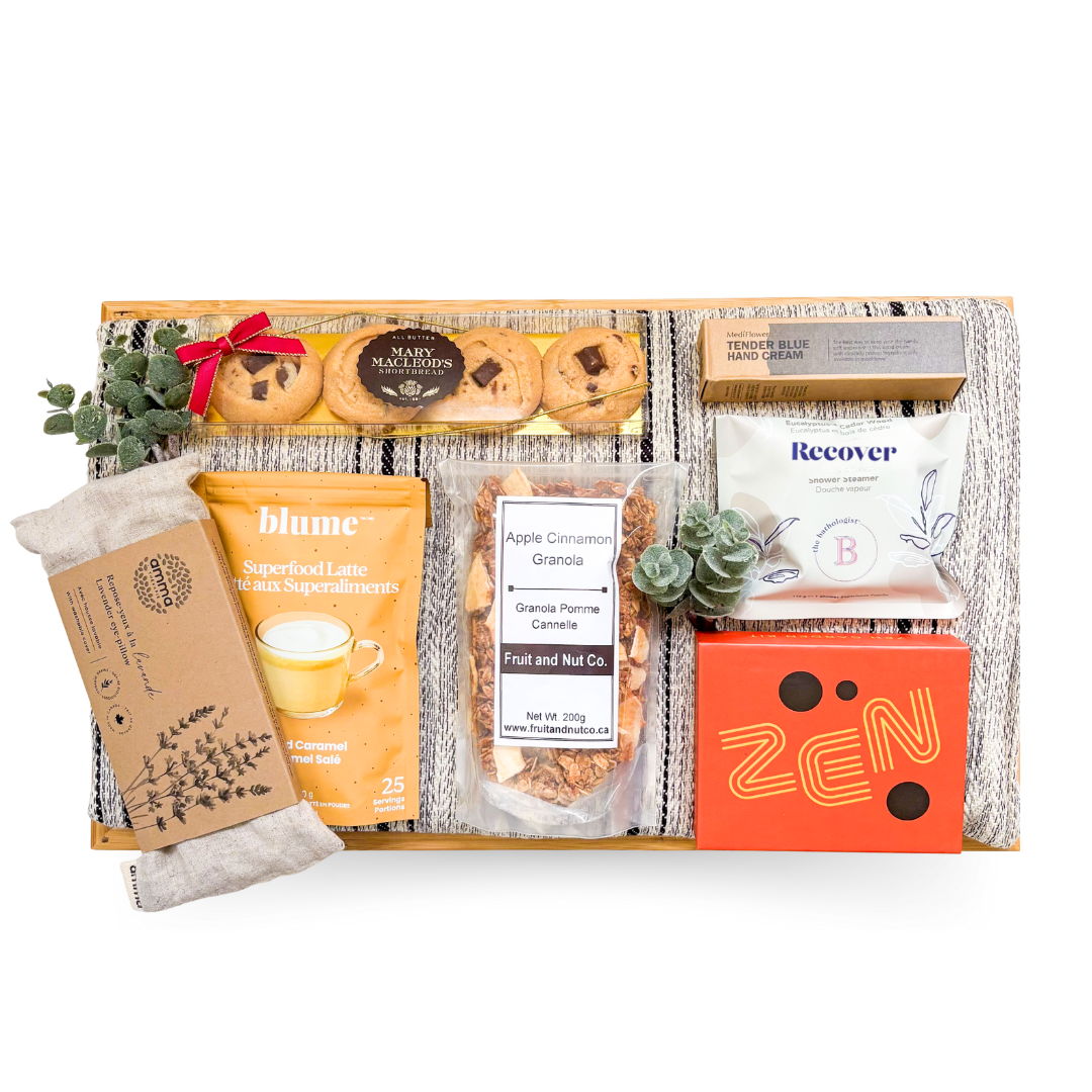 The Recovery Edit is a refined recovery gift basket beautifully arranged on a reusable bamboo bed tray, blending comfort and wellness in an elevated way. With soft textures, nourishing treats, and restorative self care details, this gift is designed to support slow days, quiet healing, and intentional rest.