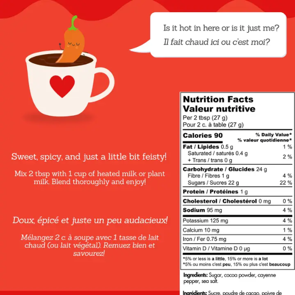 Made with only the finest all-natural ingredients — cocoa powder, cane sugar, cayenne, and Himalayan sea salt — this mix is gluten-free, nut-free, soy-free, and vegan-friendly (when made with a milk alternative).