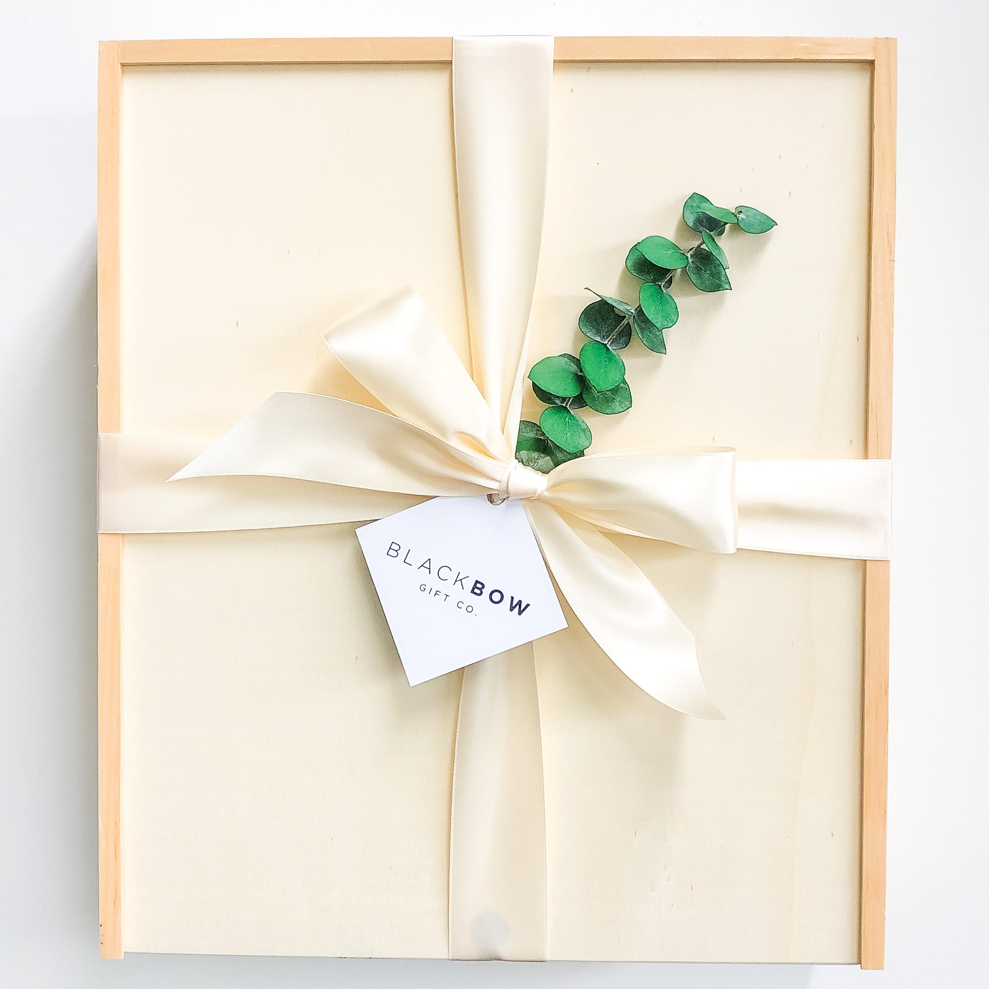 - Your gift box is tied perfectly with a premium double satin ribbon (as shown) and is accented with our hand-selected and seasonal preserved florals, greenery and other naturals making each gift that much more special and unique