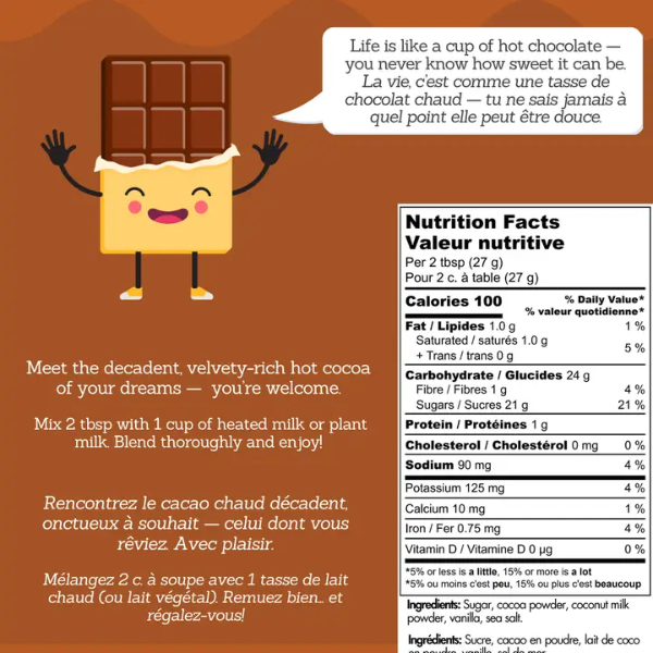 Crafted with premium cocoa powder, cane sugar, coconut milk powder, and Himalayan sea salt, it’s a treat you can feel good about — gluten-free, vegan, soy-free, and preservative-free. Enjoy it on your own or gift it to someone special for a warm, cozy surprise.